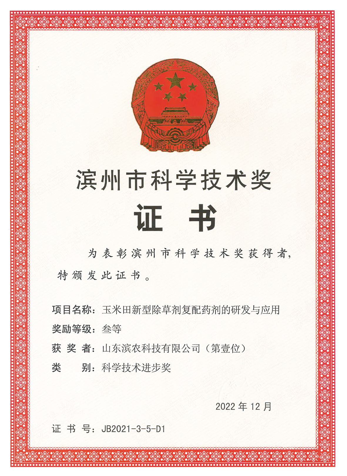 我公司一項(xiàng)目榮獲濱州市科學(xué)技術(shù)進(jìn)步獎(jiǎng)三等獎(jiǎng)發(fā)布時(shí)間:2023-02-10 09:21為全面落實(shí)黨的二十大精神,加快科技自立自強(qiáng),深入實(shí)施科教興濱,科教興企,創(chuàng)新驅(qū)動(dòng)發(fā)展戰(zhàn)略,我公司聯(lián)合濱州市農(nóng)業(yè)技術(shù)推廣技術(shù)中心以及濱州市農(nóng)業(yè)綜合執(zhí)法支隊(duì)申報(bào)的“玉米田新型除草劑復(fù)配藥劑的研發(fā)與應(yīng)用”項(xiàng)目,根據(jù)《濱州市科學(xué)技術(shù)獎(jiǎng)勵(lì)辦法》規(guī)定,經(jīng)過(guò)初評(píng)、市科學(xué)技術(shù)評(píng)審委員會(huì)評(píng)審、市科技局審核,該項(xiàng)目榮獲濱州市科學(xué)技術(shù)進(jìn)步獎(jiǎng)三等獎(jiǎng)。 ![]() |