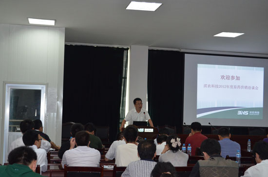會議由采購部經理王銀鋒主持,副總經理閆勇致歡迎詞,就國內外原藥近幾年的現(xiàn)狀及未來發(fā)展趨勢做了詳細分析,并指出了今后原藥市場發(fā)展的方向。原藥部經理孫朝星為來賓詳細介紹了濱農的發(fā)展歷程,近幾年國內外市場齊頭并進蓬勃發(fā)展的現(xiàn)狀。供應商代表京博農化科技股份有限公司總經理戴榮華、采購商代表山東三農生物科技有限公司董事長吳文廷結合與濱農多年的合作情況,做了典型發(fā)言。