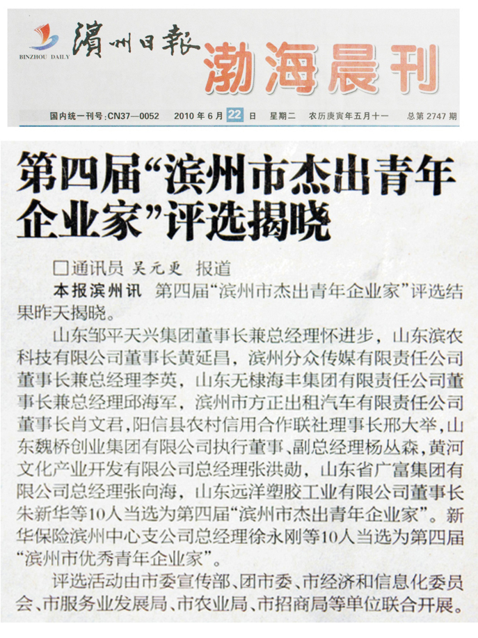 第四屆“濱州市杰出青年企業家”評選結果已于6月22日揭曉,我公司董事長黃延昌等10位優秀企業家當選為第四屆“濱州市杰出青年企業家”。評選活動由市委宣傳部、團市委、市經濟和信息化委員會、市服務業發展局、市農業局、市招商局等單位聯合開展。